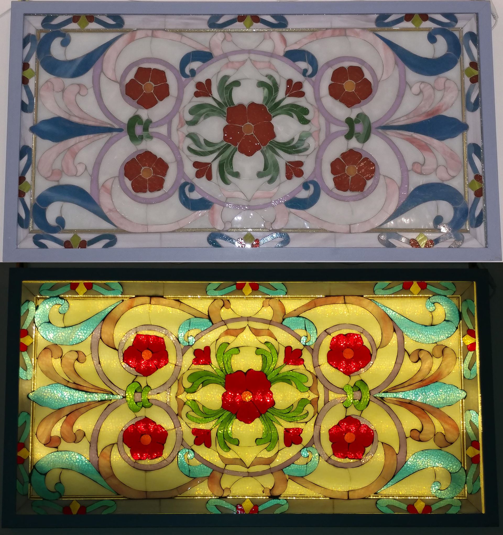 Glued stained glass pattern, back-lit